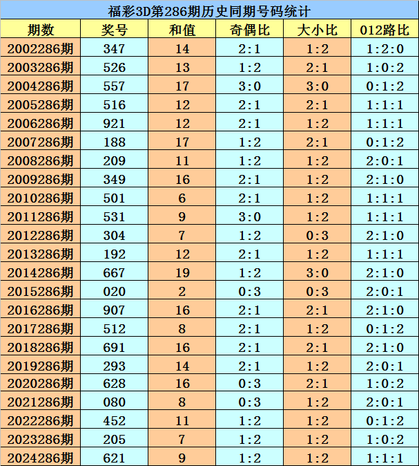 福彩3D第2025286期开奖日期:2025年10月27日,历史上第286期已开出了23次奖号,历年同期号码分别为:347、526、557、516、921、188、209、349、501、531、304、192、667、020、907、512、691、293、628、080、452、205、621。