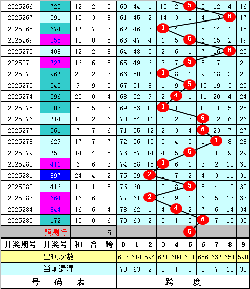 福彩3D第2025285期最大跨度开出6,跨度近期分布比较密集,主要分布在2-6区段,本期预计最大跨度在3-7区段出现,最大跨度关注34567,精选跨度5。