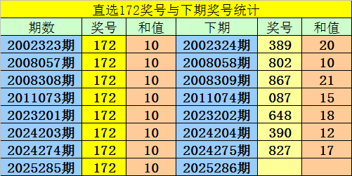 第2025285期3D奖号为:172,历史上该号码直选开出8次,下期号码分别为:389、802、867、087、648、390、827。