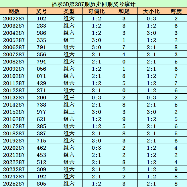 福彩3D历年第287期同期奖号为:102 283 986 335 791 356 794 056 071 429 271 200 738 977 621 285 387 715 462 453 512 309 192 805。