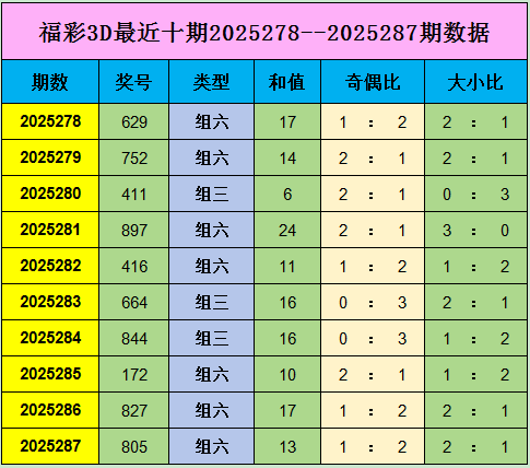福彩3D上期开出奖号为805,奖号为组六形态,和值为13,奇偶比为1 : 2,大小比为2 : 1。