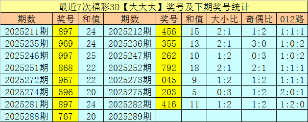 一、福彩3D上期奖号为767,大小类型开出:大大大,历史上该大小类型奖号共出现1090次,最近7次【大大大】奖号分别开出:897、969、997、868、967、596、897,其中组三号码出现3次,组六号码出现4次。