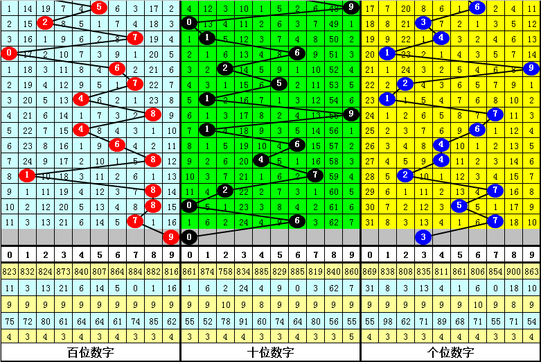 百位上期开出号码7,下降了1个点,本期预计反向上升,参考号码9。