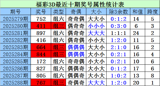 上期回顾:上期开奖奖号为767,类型:组三,奇偶奇,大大大,1:2:0,和值20,跨度1。