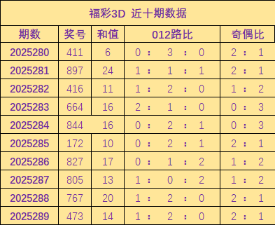 开奖回顾:福彩3D上期奖号为473,其中奖号012路比为1:2:0,和值为14,奇偶比2:1。