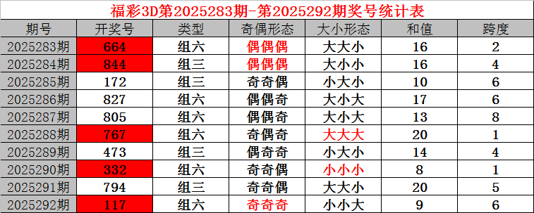 上期回顾:福利彩票3D第2025292期开奖结果117。奖号:奇奇奇、小小大,和值9,跨度6。
