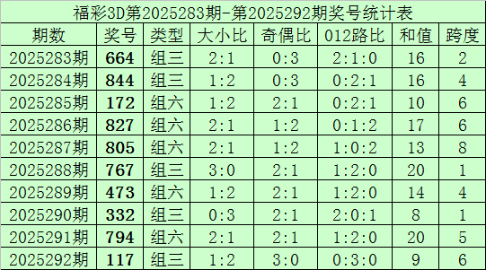开奖回顾:福彩3D第2025292期奖号为117,其中奖号大小比为1:2,奇偶比为3:0,012路比为0:3:0,和值为9,跨度为6。