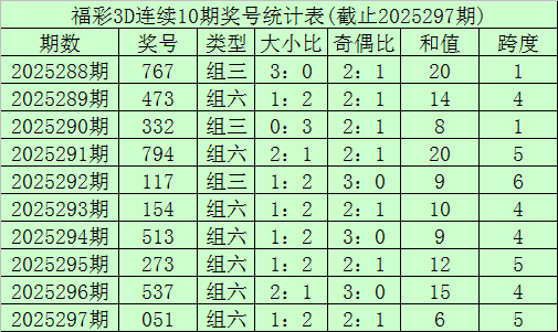 开奖回顾:福利彩票3D第25297期奖号开出051。奖号类型为组六,奇偶形态为偶奇奇,大小形态为小大小。