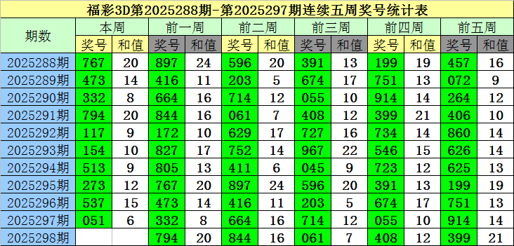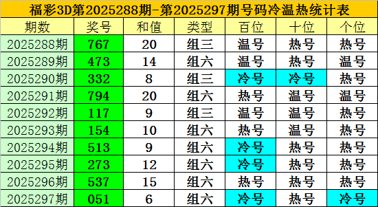 上期回顾:福彩3D第2025297期开奖奖号为:051,奖号类型为:组六,奖号冷温热态为:冷号+热号+冷号。
