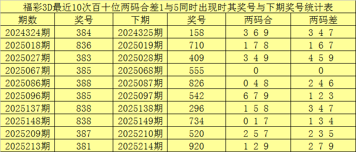 百十位合差分析:上期奖号百十位开出38组合,两码合为1,两码差为5,最近10次百十位两码合1与两码差5同时出现时,其奖号和下期奖号分别为: