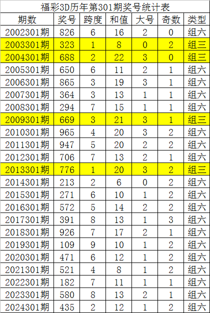 福彩3D历年第301期同期分别开出奖号:826、323、688、650、865、364、294、669、965、947、706、776、213、271、572、391、926、109、471、521、182、580、435,详细统计见下表: