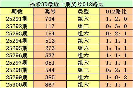 开奖回顾:第2025300期3D奖号为867。形态:组六,奇偶比1:2,大小比3:0,012路比为1:1:1。