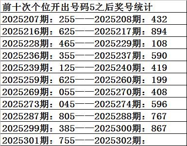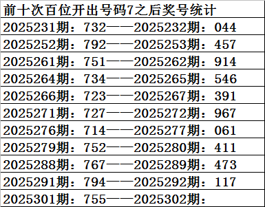 一、上期开奖:福利彩票3D第2025301期奖号为755。奇偶比为3:0,大小比为:3:0,奖号和值为17,奖号跨度为2。