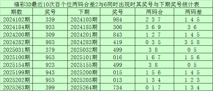 百个位合差分析:上期奖号百个位开出93组合,两码合为2,两码差为6,最近10次百个位两码合2与两码差6同时出现时,其奖号和下期奖号分别为: