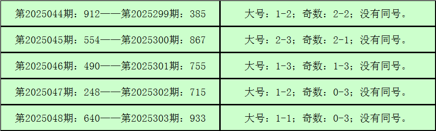 所以,3D第2025300期开出奖号:867,其大小比为3:0,奇偶比为1:2,012路比为1:1:1,与3D第2025304期奖号可能有同号。