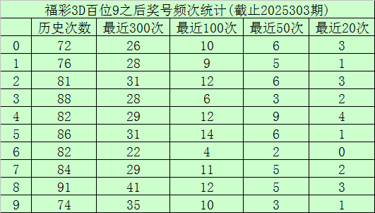 百位杀号:上期百位开出号码9,历史上百位号码9已开出817次了,最近100次百位号码9出现之后,其下期各号码频次分别为:号码5出现14次,2、4、8出现12次,7出现11次,0、9出现10次,1出现9次,3出现6次,6出现4次。