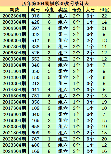 历年第304期福彩3D同期奖号为:976 - 428 - 597 - 332 - 517 - 338 - 525 - 552 - 340 - 350 - 150 - 212 - 041 - 751 - 856 - 109 - 340 - 465 - 658 - 609 - 767 - 480 - 169。