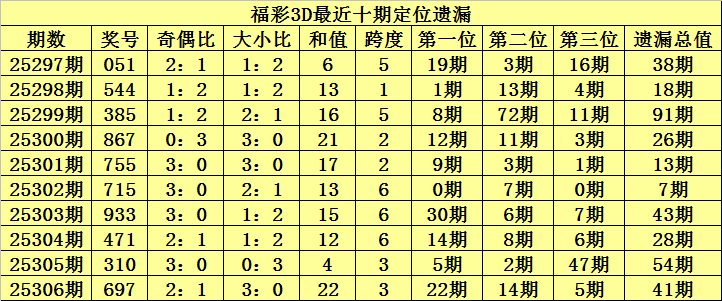 开奖回顾:福彩3D第2025306期奖号:697,百位号码遗漏22期、十位号码遗漏14期、个位号码遗漏5期,遗漏总值为41期。