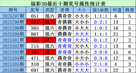 上期回顾:上期开奖奖号为697,类型:组六,偶奇奇,大大大,2:1:0,和值22,跨度3。