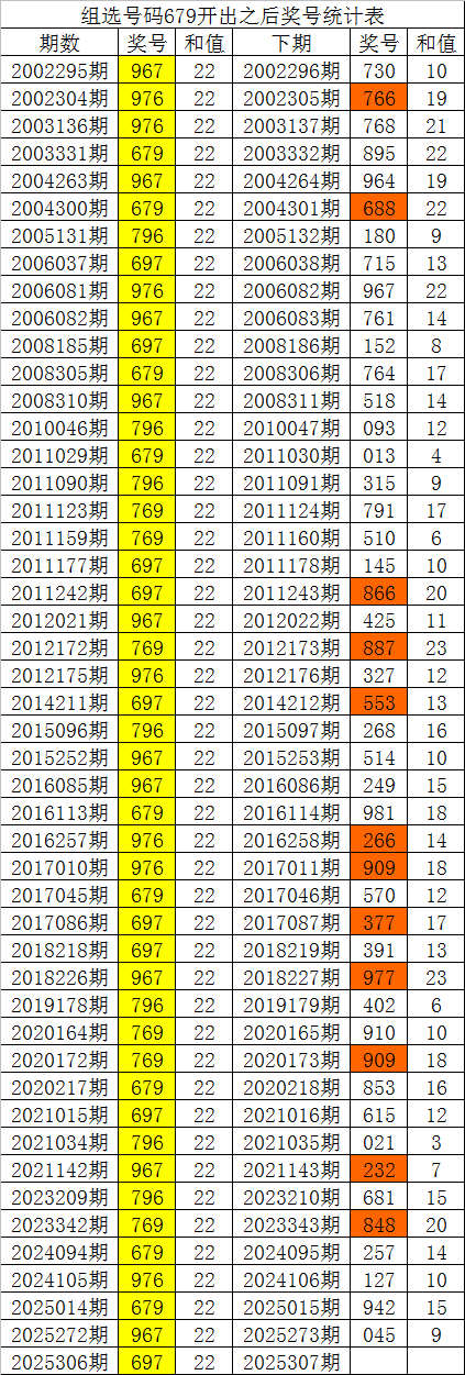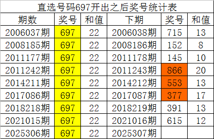 从以上统计可以看出,直选号码697出现之后,其下期奖号:1.下期大号出现概率100%;