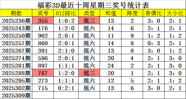 福利彩票3D上周三:第2025302期奖号为715。