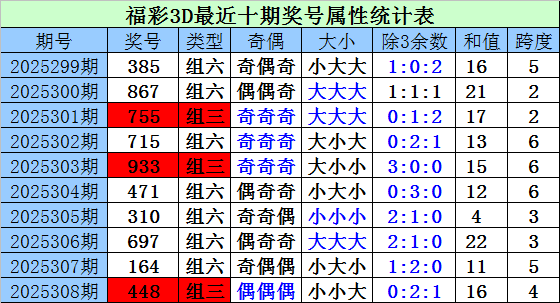 上期回顾:上期开奖奖号为448,类型:组三,偶偶偶,小小大,0:2:1,和值16,跨度4。