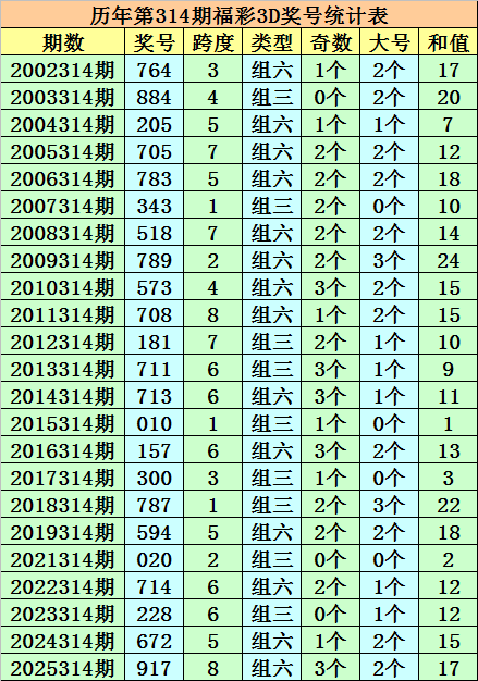 在以上奖号中奖,历年第315期福彩3D出现1次豹子,出现6次组三,出现15次组六。组六开出比例较高,本期继续关注组六。