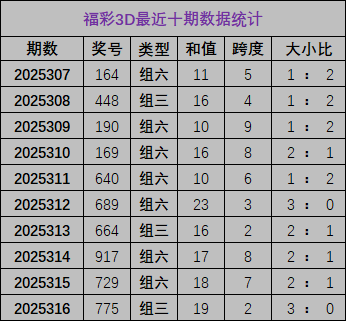 开奖回顾:福彩3D上期开奖号为775,和值为19,跨度2,其中奖号大小比为3:0
