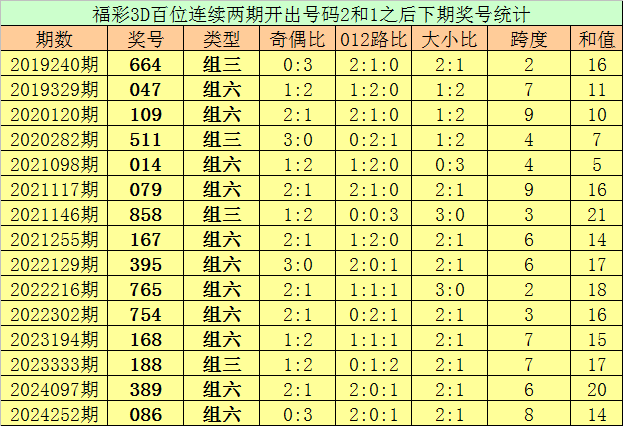 百位号码:连续两期百位出号分别为:2-1,历史上福彩3D连续两期前后分别出号2-1的奖号共出现72次。在百位2-1的奖号现象出现时,近15期下期分别出号:664-047-109-511-014-079-858-167-395-765-754-168-188-389-086;