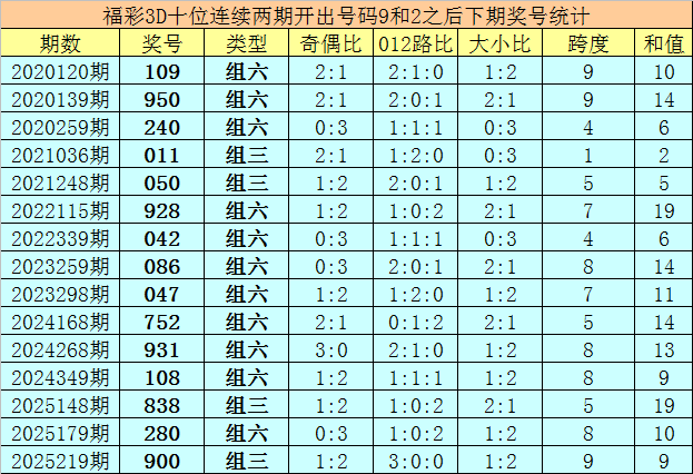 十位号码:前两期十位分别出现奖号9-2,历史上福彩3D连续前后分别开出号码9-2的现象共开出69次。在十位9-2的现象出现时,最近15期其下期分别开出号码:109-950-240-011-050-928-042-086-047-752-931-108-838-280-900;
