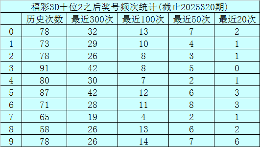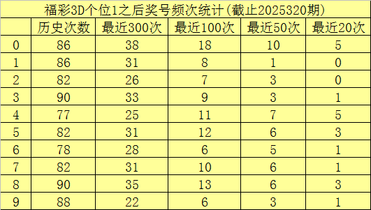个位杀号:上期个位奖号为1,历史上个位奖号1共开出842次,最近100次个位奖号1出现时,其下期号码0-9开出次数分别为:奖号0开出18次,8开出13次,5开出12次,4开出11次,7开出10次,3开出9次,1开出8次,2开出7次,6、9开出6次。