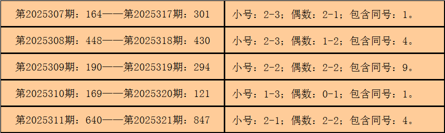 统计3D历史上已开出的奖号发现,在连续5期开奖号码中:3D在第2025307期-第2025311期分别开出奖号:164-448-190-169-640。