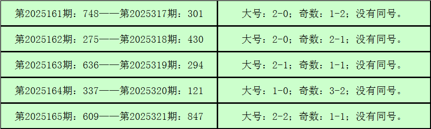统计3D历史上已开出的奖号发现,在连续5期开奖号码中:3D在第2025161期-第2025165期分别开出奖号:748-275-636-337-609。