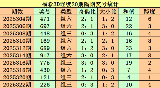跨度:近5期跨度分布在1-7之间,振幅为7点,分布非常分散,上期跨度为4,重复出现,本期看好跨度走小,关注跨度2。