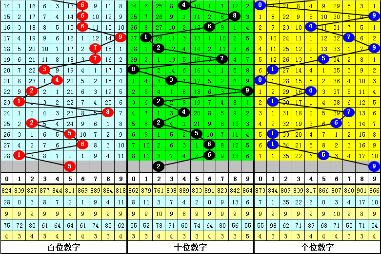 百位:上期奖号为:1,该位大小 号走势趋于平衡,上期下降5点,本期预计该位上升,参考号码5。