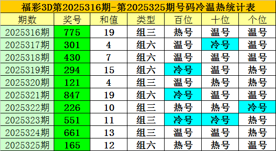 上期回顾:福彩3D第2025325期开奖奖号为:165,奖号类型为:组六,奖号冷温热态为:热号+热号+温号。