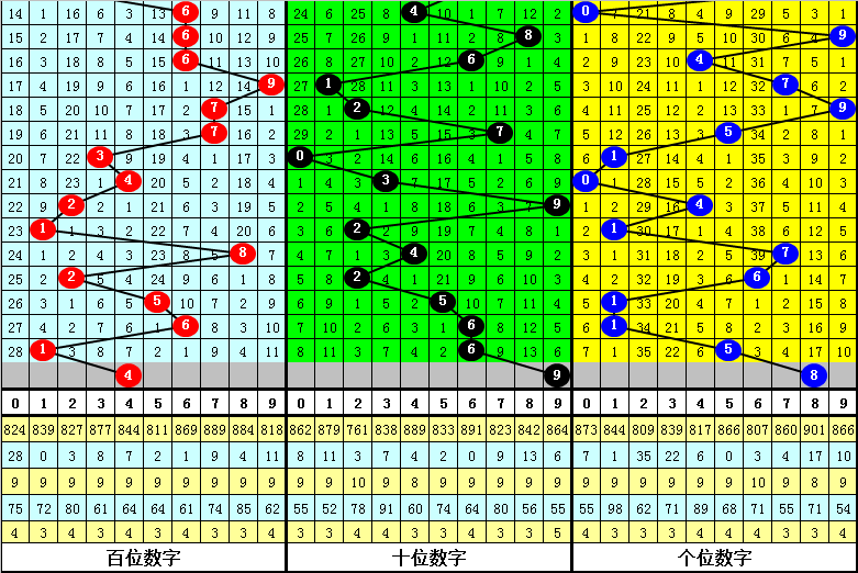 十位上期出号6重复出现,本期看好该位上升,关注号码9。