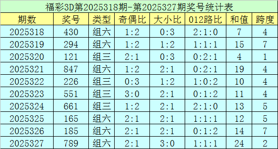 上期回顾:福彩3D第2025327期开奖号码为789,组选类型为组六,奇偶比为2:1,大小比为3:0。