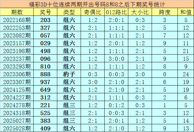 十位号码:前两期十位分别出现奖号8-8,历史上福彩3D连续前后分别开出号码8-8的现象共开出73次。在十位8-8的现象出现时,最近15期其下期分别开出号码:203-327-057-029-498-096-810-888-937-649-312-221-525-383-409;