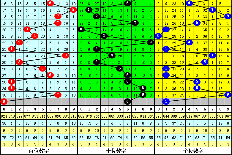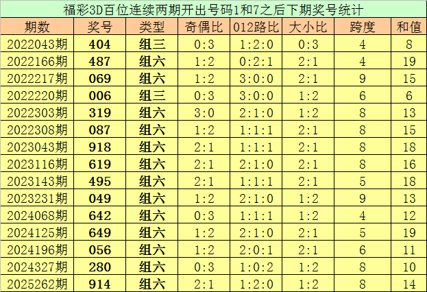 百位号码:连续两期百位出号分别为:1-7,历史上福彩3D连续两期前后分别出号1-7的奖号共出现74次。在百位1-7的奖号现象出现时,近15期下期分别出号:404-487-069-006-319-087-918-619-495-049-642-649-056-280-914;