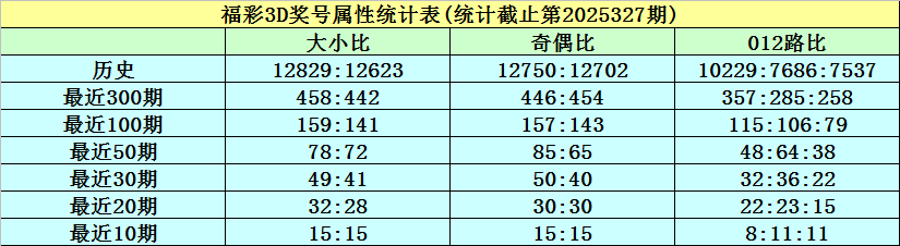 开奖回顾:福彩3D第2025327期奖号为789,其中奖号大小比为3:0,奇偶比为2:1,012路比为1:1:1,和值为24,跨度为2。