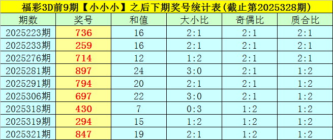 一、上期回顾:福彩3D第2025328期奖号为:040,奖号类型开出组三,大小比为0:3,奇偶比为0:3,和值为4,跨度为4,012路比为2:1:0。