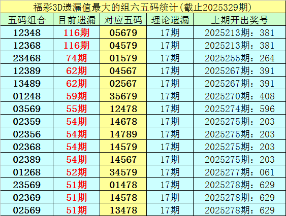 福彩3D五码遗漏组六分析(第2002001期-第2025329期)