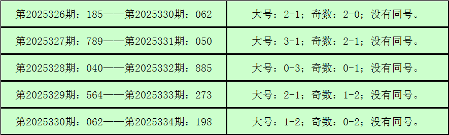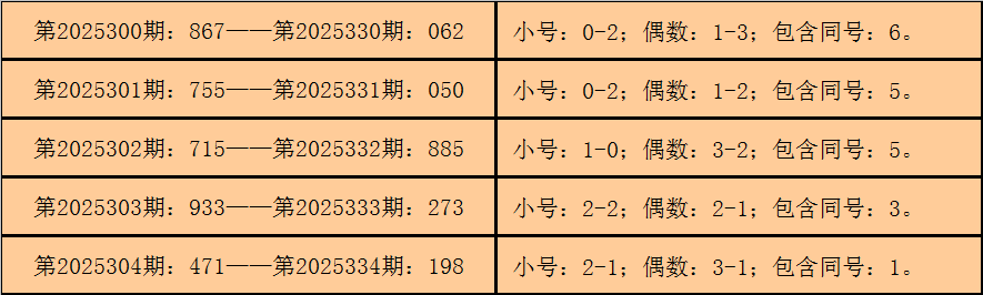 所以,3D第2025305期开出奖号:310,其大小比为0:3,奇偶比为2:1,012路比为2:1:0,与3D第2025335期奖号可能有同号。