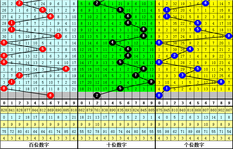 跨度分析:最近周二跨度出现范围在2-8区间,跨度比较集中,上周二跨度为2,跨度下降2个点位,本期看好跨度上升,参考跨度6。