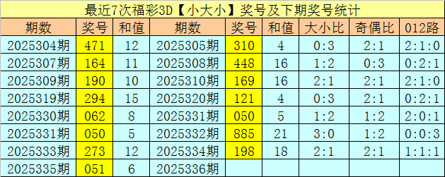 二、最近7次【小大小】奖号之后,其下期分别开出号码:310、448、169、121、050、885、198,其中组三号码出现4次,组六号码出现3次。本期预计开出组六号码。