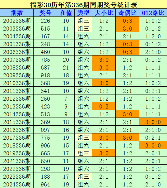 组选类型判断:在第336期历史同期开奖中,组六开出17次,组三开出5次,今年同期防开出组三号码。