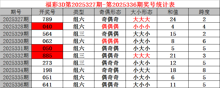 上期回顾:福利彩票3D第2025336期开奖结果641。奖号:偶偶奇、大小小,和值11,跨度5。