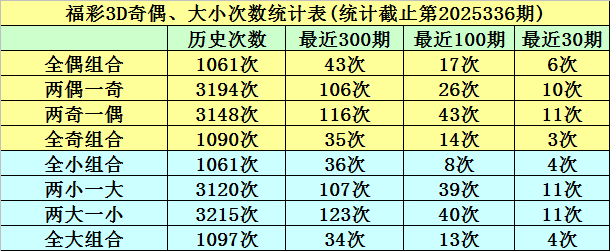 在前10期开奖中,全小组合出现1次,两小一大组合出现5次,两大一小组合出现2次,全大组合出现2次,本期预计开出两大一小组合。