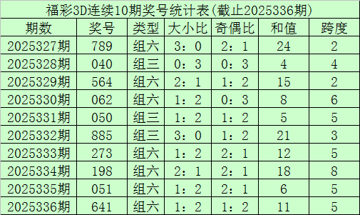 开奖回顾:福利彩票3D第25336期奖号开出641。奖号类型为组六,奇偶形态为偶偶奇,大小形态为大小小。